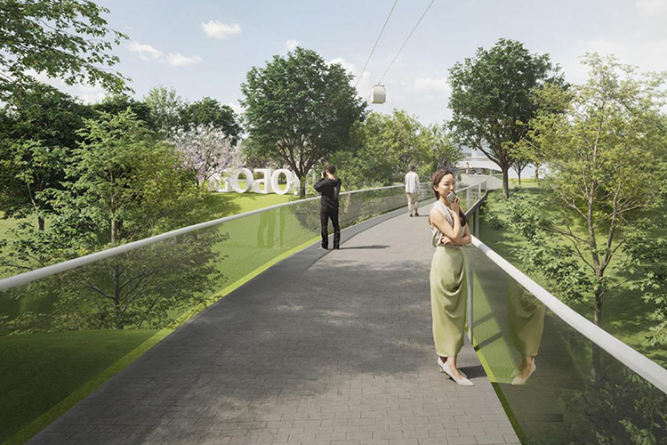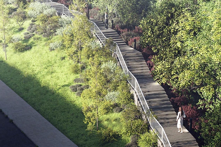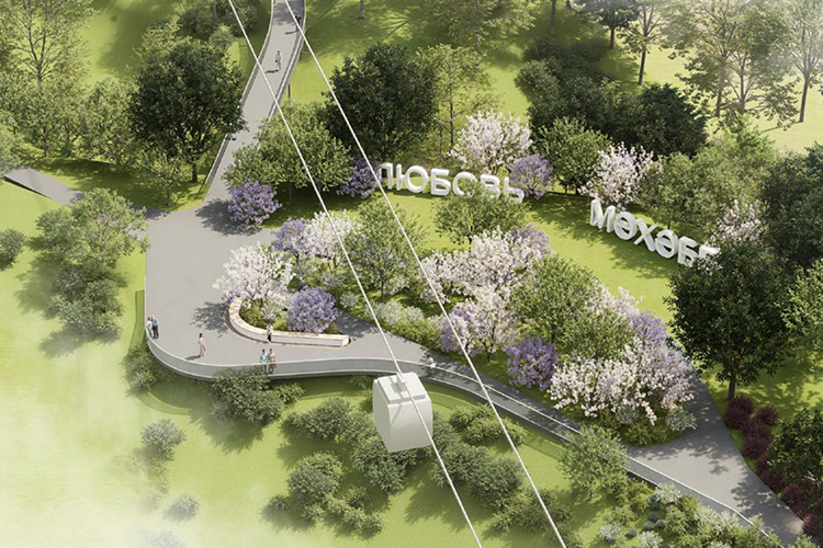 От центральной аллеи парка до спуска предлагается пройти двумя способами — по уже существующей дороге либо через новый предполагаемый здесь мост. Напротив арт-объекта «Любовь – Мәхәббәт» организуют смотровую площадку, а дальше аккуратный спуск с зеркальными ограждениями. На эскизах показали, что планируется еще и пышно озеленить эти территории. Общая площадь застройки — 850 кв. метров.