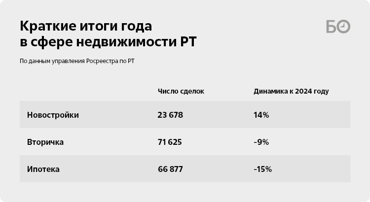 По данным сервиса «Яндекс.Недвижимость», чьи данные приводит «Коммерсантъ», цена «квадрата» новостроек по Татарстану — 235 тыс. рублей, что на 14% больше, чем год назад. На вторичке же за год отмечается рост на те же 7%, что и у «Авито Недвижимость» — но до 158 тыс. рублей. По Казани «Яндекс.Недвижимость» показывает цену 1 кв. метра в 257 тыс. рублей с ростом за год в 14,3%. А вторичка в столице РТ подорожала на 9,4% — к концу 2025 года цена уже 195 тыс. рублей за «квадрат».