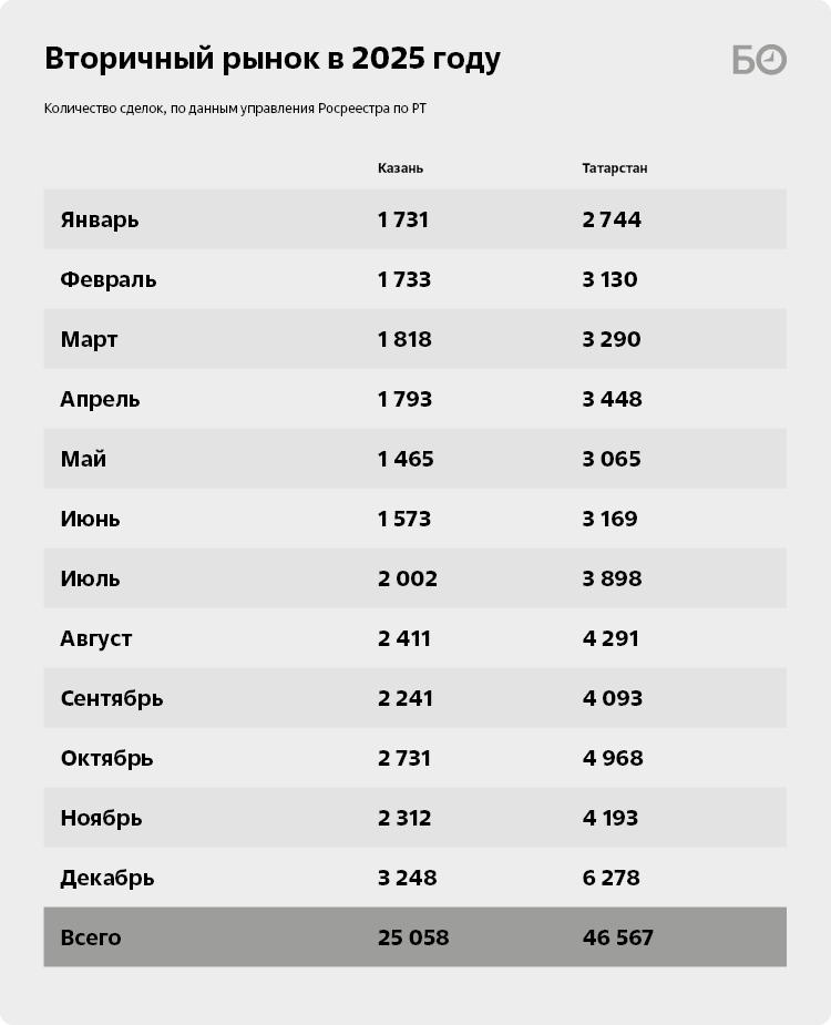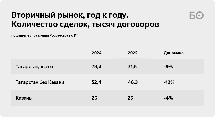 Так что не удивительно, что вторичка в декабре тоже взлетела. Было заключено 9,5 тыс. сделок по Татарстану, из них 3,2 тыс. — в Казани. Это на 45% больше, чем в ноябре. Но все же на треть меньше, чем в декабре 2024 года. Всего же в 2025 году продали 71,6 тыс. вторичной недвижимости, но к аналогичному периоду показатель оказался ниже на 9%. В общем — вторичка продолжает валиться в пропасть.