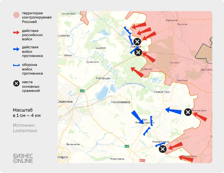 «Сейчас идут бои в районах автостанции и пожарной части Лимана, а также улиц Циолковского и Гвардейской в микрорайоне Коммунальный. Восточная часть Лимана со стороны Торского и Заречного прикрывается мощным фортификационным узлом ВСУ, возведенным в зданиях ЦРБ и изолятора ЦРБ, а также в полуразрушенных многоквартирных домах на улице Пушкина. По этому узлу на регулярной основе работает ствольная и реактивная артиллерия, а также наносят удары планирующими ФАБ экипажи Су-34», — сообщает телеграм-канал «Военная хроника».
