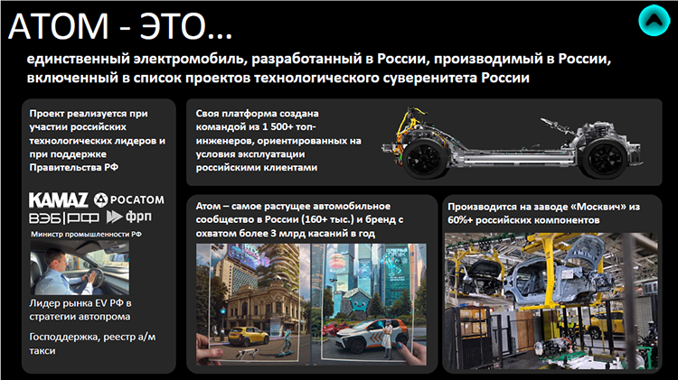Что клиент получит за 3 млн рублей (оговоримся, это стоимость на сегодняшний день)? «Атом» — это не только продукт, но и самое большое растущее автомобильное сообщество в России на сегодняшний день, расписывали на презентации. У электрокара, как заявляется, высокая степень локализации — больше 60%. «Очень много компонентов, в том числе весь кузов, производится в Татарстане», — указал Кияшко. Где именно в республике, не прозвучало.
