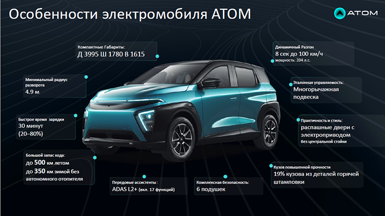 Мощность «Атома» — 204 л. с., разгоняется до 100 км/ч за 8 секунд. У него распашные двери с электроприводом без центральной стойки, которые производитель называет признаком «премиум-сегмента». Посадка в «Атоме» уровнем выше, чем в бизнес-классе, без касания дверей: водитель нажимает кнопку на руле, двери распахиваются автоматически, пассажир садится, водитель закрывает двери. Автоматические двери обладают датчиками, которые способствуют безопасному открытию. Есть 6 подушек безопасности.