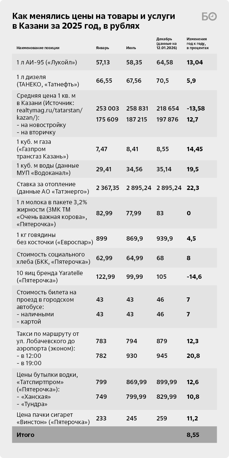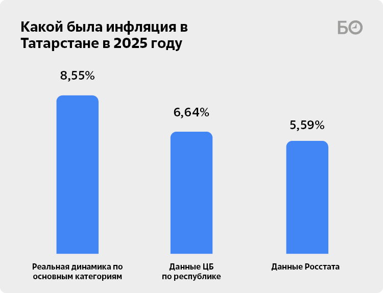 Какими получились первые результаты? По данным Росстата, инфляция в стране в 2025-м составила 5,59% (против 9,52% в 2024-м). Продовольственные товары за тот год подорожали в среднем на 5,24%, а непродовольственные — на 2,99%. Отделение Банка России – Национальный банк по РТ оценивает инфляцию в республике в 2025 году в 6,64%. «Это выше, чем в целом по стране (5,59 процента) и Приволжском федеральном округе (6,39 процента)», — печально констатировали в пресс-службе регулятора. Наши подсчеты оказались еще печальнее: средний показатель инфляции товаров и услуг составил 8,55%. Разница с официальными данными Росстата — 50,2%.