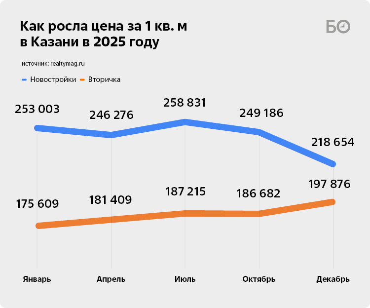 На рынке вторички «квадрат» за I квартал 2025 года только прибавлял в цене — с 175,6 тыс. до 181,4 тыс. рублей (плюс 3,3%). Активизация движения произошла на фоне пусть и незначительного, но снижения ключевой ставки и переориентации части покупателей с новостроек на вторичку. Как писал «БИЗНЕС Online» в декабре, количество зарегистрированных Росреестром договоров купли-продажи, мены, дарения жилых помещений за ноябрь по Татарстану хоть и сократилось на 16% до 8 тыс., но к аналогичному периоду 2024 года выросло на 2%. В декабре 2025-го стоимость одного квадратного метра стала достигать 197 тыс. рублей (плюс 12,7% по сравнению с январем).