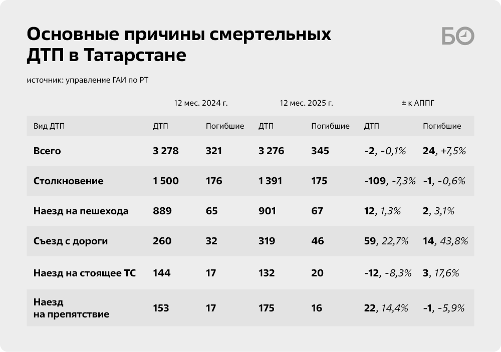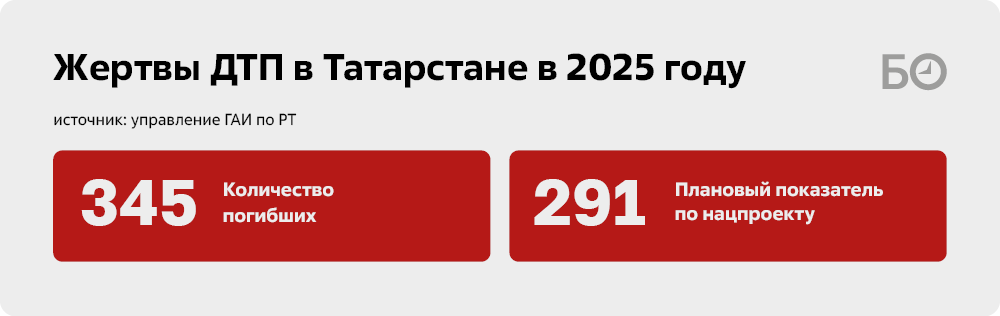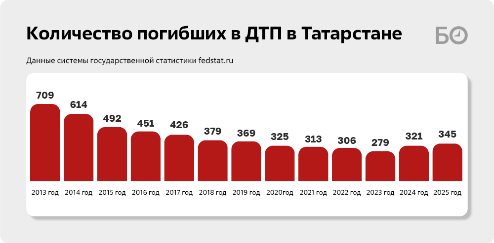 К конкретным к цифрам: в прошлом году в ДТП на территории Татарстана погибли 345 человек — это на 24 человека больше, чем годом ранее, и на 66 больше, чем в 2023-м. По грубым подсчетам, на 100 тыс. жителей республики приходится 8,5 погибшего в автомобильных авариях (этот показатель называется «социальный риск»). Это ниже, чем в среднем по России в 2025 году (9,5 погибшего на 100 тыс. населения).