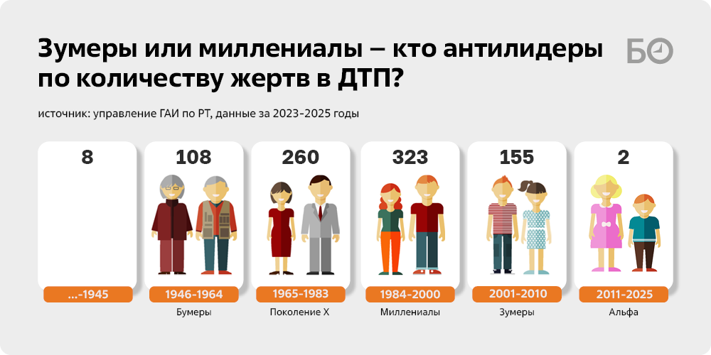 В управлении ГАИ по РТ на основании изучения материалов ДТП пришли к выводу, что водители-миллениалы (1984–2000 годов рождения) и водители поколения Х (1965–1983 годов рождения) — лидеры по количеству жертв в ДТП в Татарстане в 2023–2025 годах. А зумеры (2001-2010) по количеству устроенных ДТП обогнали бумеров (1946-1964).