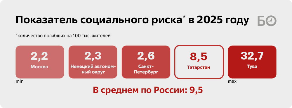 Цифры характерны в сравнении. Самый высокий показатель в стране в Туве — 32,7. В соседнем Башкортостане — 9,2. А самый низкий показатель по итогам прошлого года был в Москве — 2,2 погибших на 100 тыс. жителей, Ненецком автономном округе (2,3) и Санкт-Петербурге (2,6).
