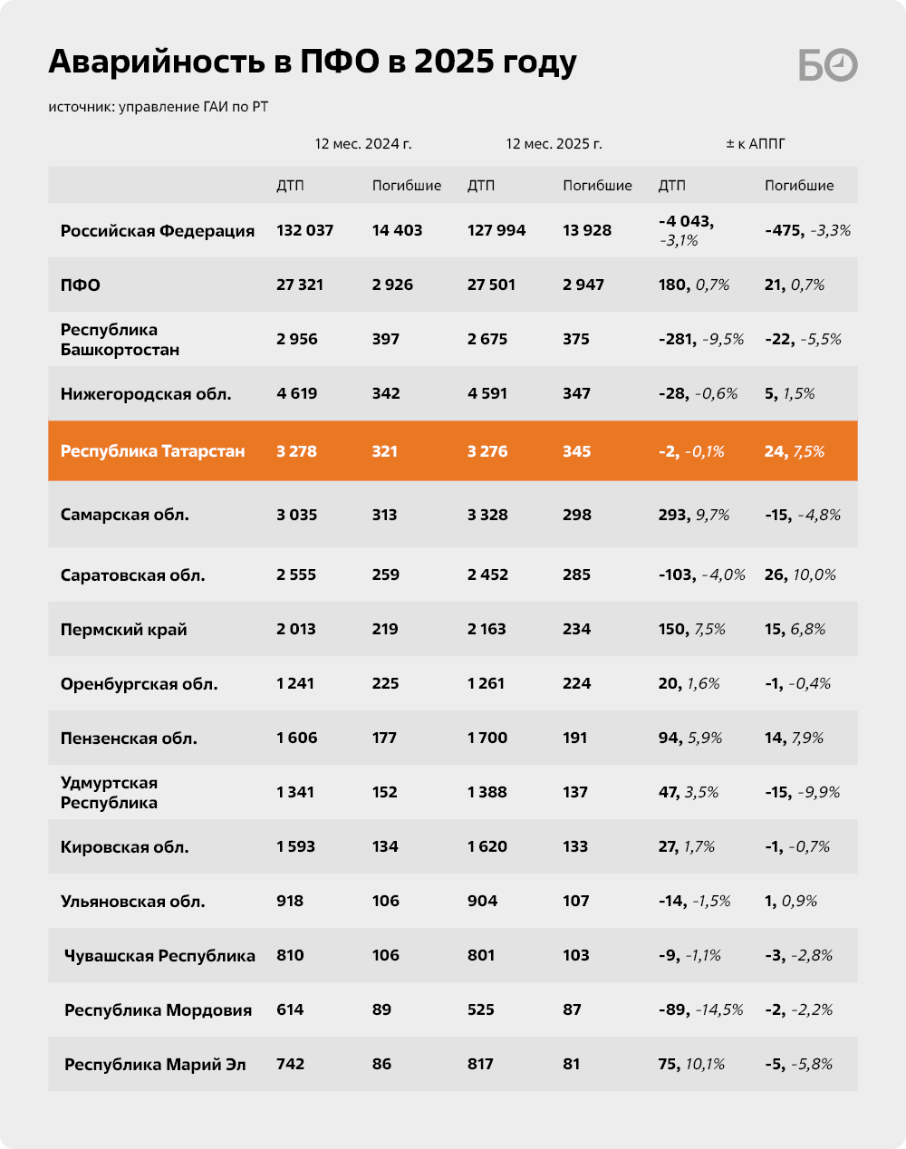 В целом по России в прошлом году стало меньше и ДТП, и погибших, и пострадавших в них, следует из свежей статистики МВД. И, если смотреть в разрезе регионов, то смертность растет не везде. Например, в тройке антилидеров по ПФО, которую замыкает республика, на первом месте Башкортостан (375 погибших, это на 22 меньше год к году), на втором — Нижегородская область (347 погибших, +5). Всего на Приволжский федеральный округ пришлась пятая часть всех жертв аварий в прошлом году (2,9 тыс. погибших из 13,9 тыс.).