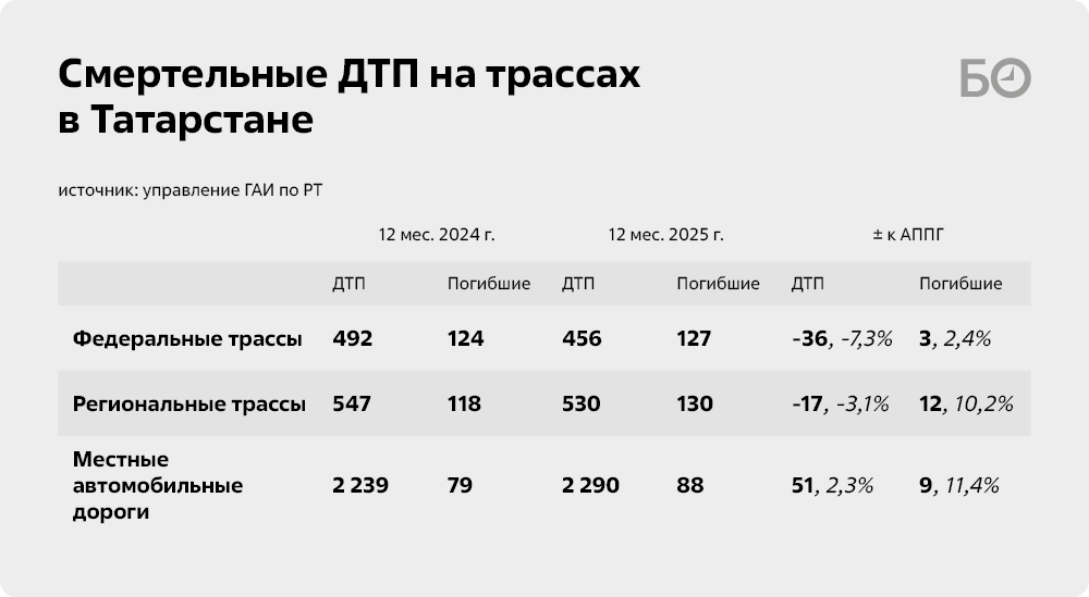 Кроме того, статистика показывает, что число аварий в «отпускные» месяцы (с июня по сентябрь) выше, чем в зимнее время. В 2025 году только на июль, август и сентябрь приходится треть всех погибших (124 человека) — пик смертности. «Аварийность прямо зависит от трафика, — соглашается Шкуматов, продолжая гипотезу с „перевертышами“. — Люди едут, на ночь не хотят останавливаться, в итоге теряют бдительность и съезжают с дороги». При этом эксперт отмечает, что в случае с перевертышами речь будет идти, скорее всего, о «загородных» ДТП. И статистика это подтверждает: по словам главного автоинспектора Татарстана Рустема Гарипова, «основной рост смертности концентрируется именно на региональной и местной сети дорог». Впрочем, растущая статистика не обошла и федеральные трассы — при снижении общего числа аварий и раненых, погибших стало больше.