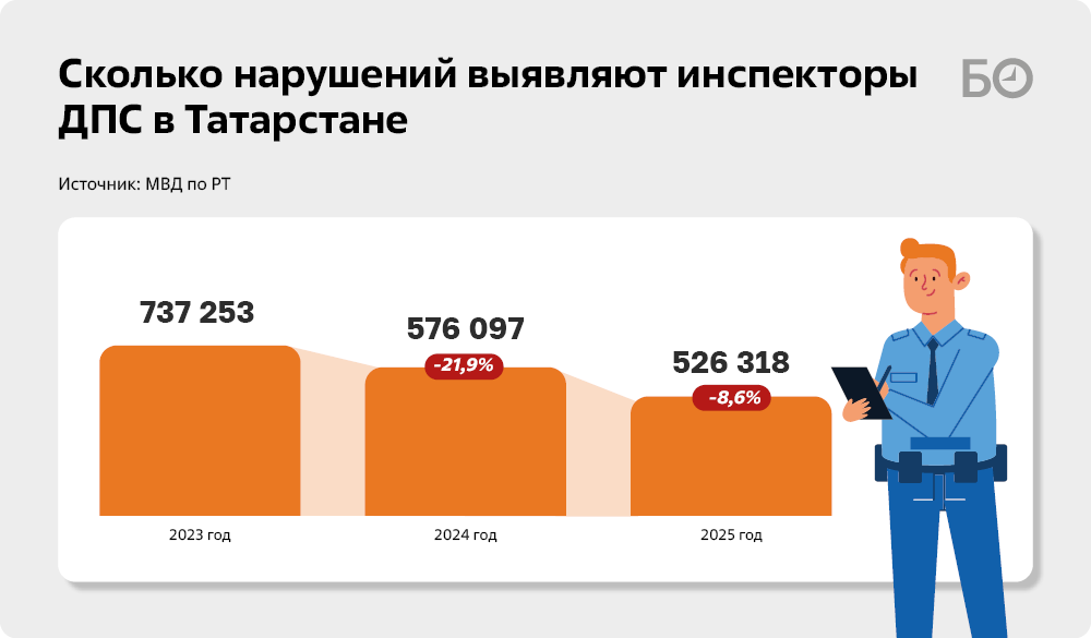 А провал в этой работе — практически в каждом втором районе Татарстана, указал замминистра. В целом в Татарстане в прошлом и позапрошлом году сотрудники ДПС выявили меньше нарушений, чем, например, в 2023-м. «Да, 2024-й мы можем объяснить отвлечением на яркую международную повестку и подросшим некомплектом с 8 до 10% — это „рабочий“ некомплект. Но в 2025 году нас уже ничто и никто не отвлекал, да и некомплект выше не стал. Тут (в некомплекте — прим. ред.) причины искать мы сегодня точно не будем», — говорил Соколов. «Ушли от надзорной деятельности — все, дорога не простила» — перечислял он районы, «свалившиеся» по выявленным сотрудниками ДПС нарушениям.