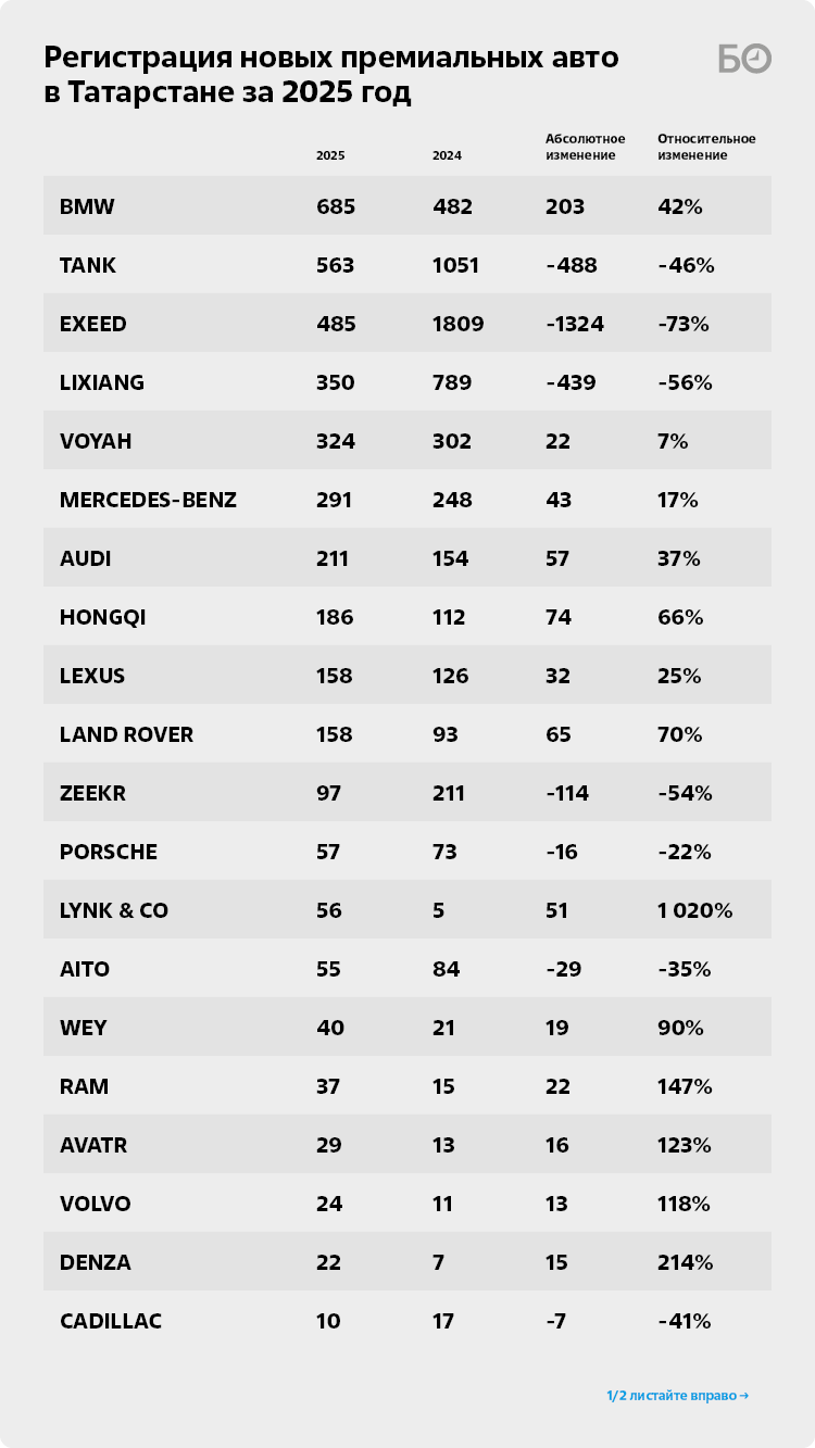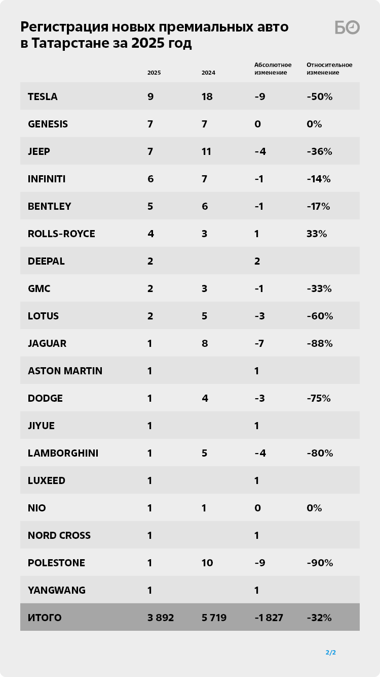 Что касается премиальных авто, то картина следующая: по итогам 2024-го было зарегистрировано 5 719 новых транспортных средств премиальных марок, в прошлом году их число снизилось до 3 892. Примерно такое же количество ставилось на учет в доковидные времена. Однако падение продаж в Татарстане также опережает среднероссийские показатели. Если в республике количество сделок просело почти на треть, то в целом по РФ — всего на 16,4% до 130,4 тыс. новых легковых автомобилей премиальных марок.