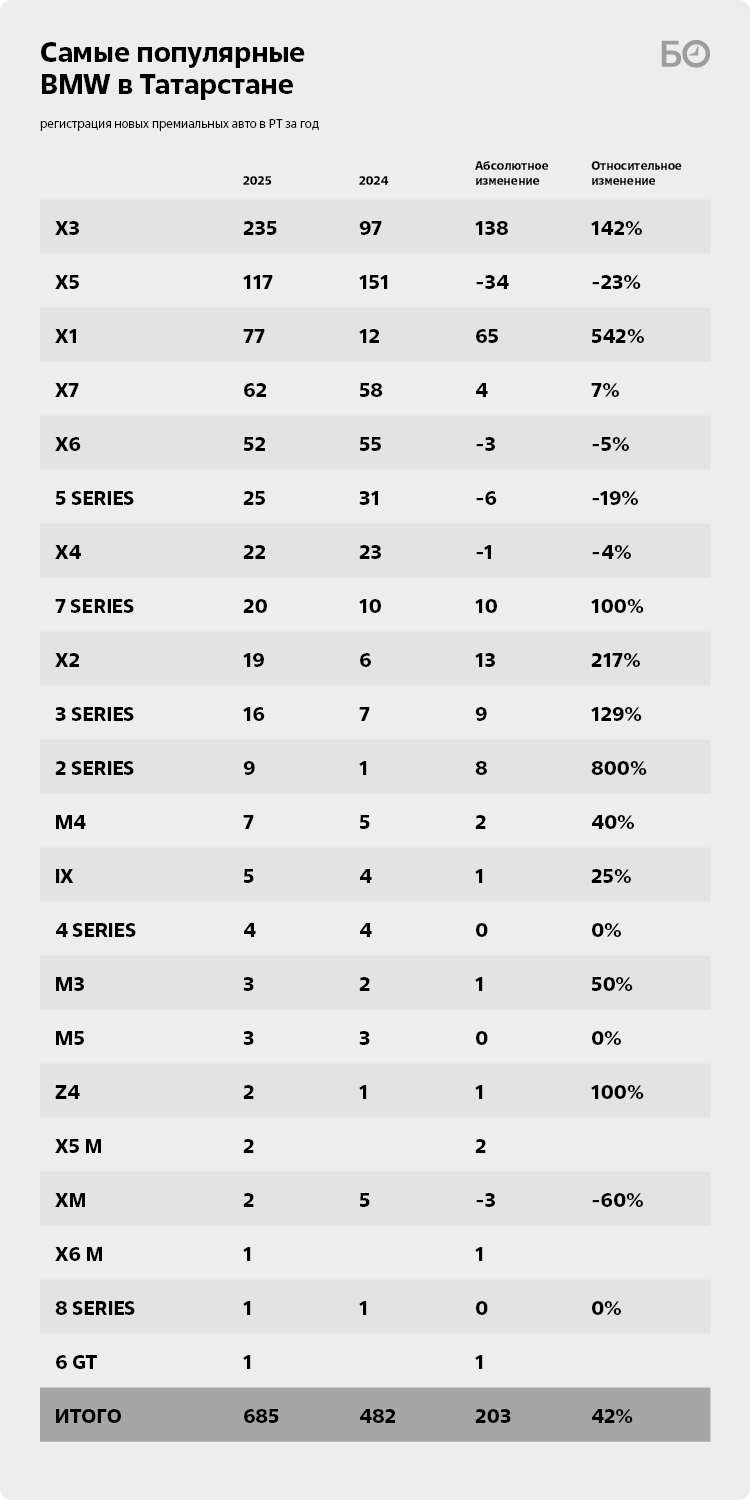 Лидером внутреннего рейтинга BMW стал люксовый компактный кроссовер в классическом кузове Х3. Автомобили такой модели приобрели 235 татарстанцев, тогда как в 2024-м — 97. Предыдущий фаворит рейтинга BMW X5 мало того что ослабил свои позиции, так еще и «уронил» продажи, которые за год снизились почти на четверть — с 151 до 117 авто. Только четверть X5 была выпущена в 2025-м, остальные — 85 авто — сошли с конвейера в 2023-м и 2024-м.