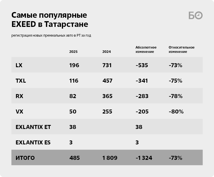Что касается помарочных продаж, то локомотивом и наиболее востребованной моделью бренда остается самый младший в линейке Exeed — Exeed LX. Такой автомобиль выбрали в качестве своего «гаражного жителя» 196 жителей РТ — на 73% меньше, чем в 2024 году.