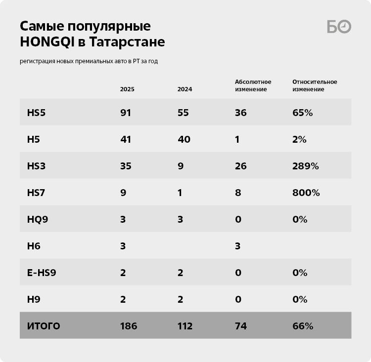 Китайский автомобильный премиум-бренд Hongqi демонстрирует рост на падающем рынке РТ: за 2025 год компания реализовала 186 автомобилей, что на 66% больше, чем за 2024 год. На текущий момент Hongqi предлагает в Татарстане восемь моделей, включая кроссоверы, седаны и минивэны.