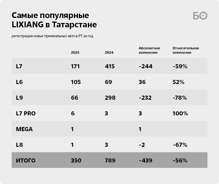 В результате в 2025-м продажи LiXiang в РТ снизились более чем в 2,2 раза. За год было продано 350 автомобилей марки, что на 56% меньше, чем в 2024-м, когда на учет поставили 789 моделей LiXiang.