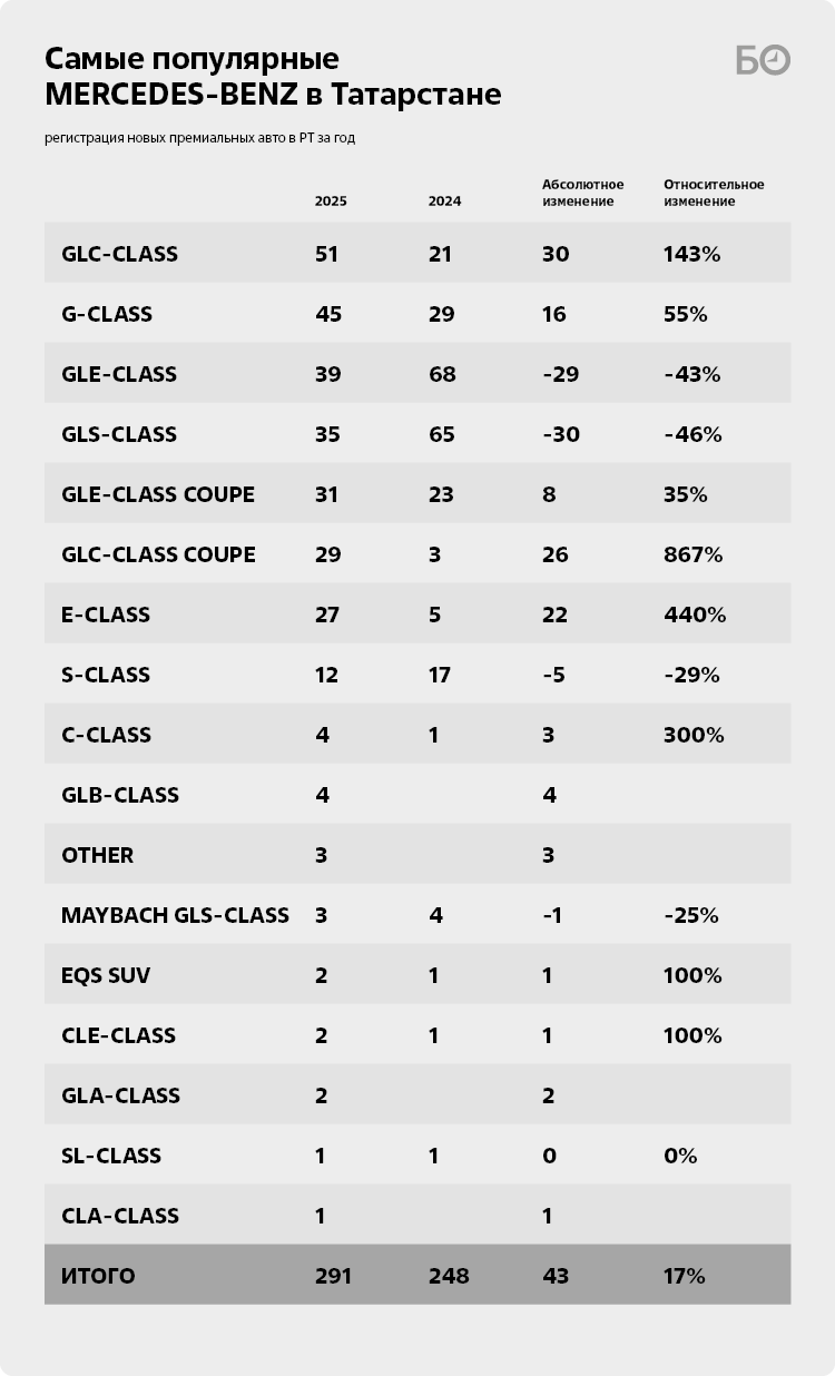 На 1-м месте по числу продаж расположился компактный кроссовер люкс-класса GLС. За прошедший период количество владельцев в Татарстане увеличилось на 30 человек, что в сумме составило 51 регистраций. Неожиданно, но на второе место по популярности вырвался полноразмерный внедорожник G-Class. По республике разъехались 45 новеньких вездеходов повышенной комфортности, что в 1,6 раза больше, чем в 2024-м.
