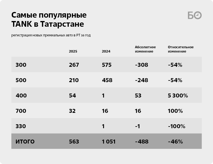 Продажи премиальных внедорожников TANK в целом по России в 2025 году превысили 18,6 тыс. автомобилей. Это почти на 35% меньше, чем было реализовано в 2024-м — 28,5 тыс. авто. В Татарстане продажи этого рамного внедорожника, который пришел на замену Lexus LX 470 или Toyota Land Cruiser 200/300, упали еще больше — на 46%, с 1 051 до 563 авто. Достаточно серьезная просадка, которая коснулась основных моделей — 300-х и 500-х.