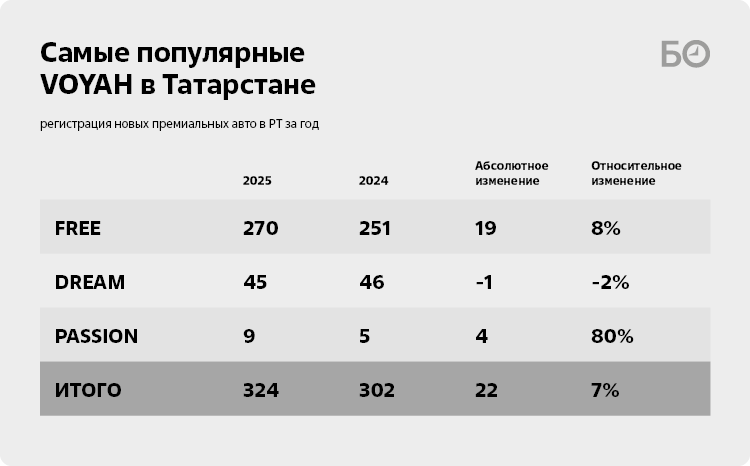 Бренд Voyah завершил прошедший год на второй строчке в общем рейтинге российского рынка NEV (автомобилей «на новых источниках энергии», куда входят гибриды и электромобили) с долей 15,9%. Согласно статистике марки, за весь 2025 год в России зарегистрировано 9465 автомобилей Voyah, что на 5,9% больше, чем в 2024 году. В Татарстане динамика продаж чуть выше — 7%. За прошедший год автодилерами было продано 324 автомобиля Voyah.