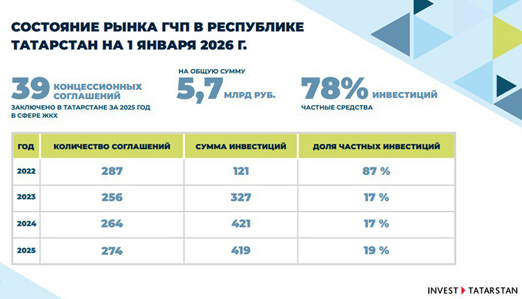 В Татарстане на начало 2026 года заключено 39 концессионных соглашений в ЖКХ (это одна из форм ГЧП) на 5,7 млрд рублей, из которых 78% — частные средства. Непосредственно соглашений в сфере ГЧП (включая концессионные соглашения и два МЧП) заключено нарастающим итогом с 2022 года на 419 млрд рублей (всего 274 соглашения). При этом доля частных инвестиций за этот период снизилась с 87 до 19%. «То есть все медленно и верно перекладывается на плечи государства», — посетовала Минуллина.