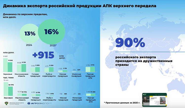 В то же время российский экспорт продукции АПК в 2024 году превысил $43,1 млрд, страна лидирует по поставкам зерновых, бобовых, растительных масел и мороженой рыбы. Растет экспорт продукции высоких переделов — по предварительным оценкам, в 2025-м это принесло свыше $900 млн дополнительных доходов. На долю дружественных стран в прошлом году пришлось 90% экспорта.