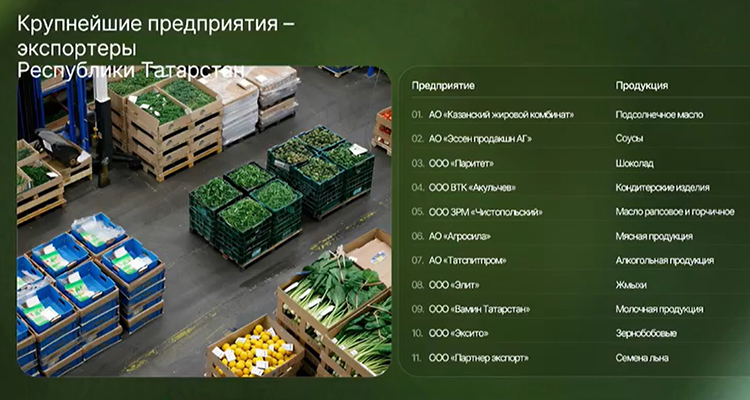 В топ-5 главных экспортеров Казанский жировой комбинат, «Эссен Продакшн», ООО «Паритет», «Акульчев» и ЗРМ «Чистопольский». В списке также компании «Агросила», «Татспиртпром» и «Вамин Татарстан».
