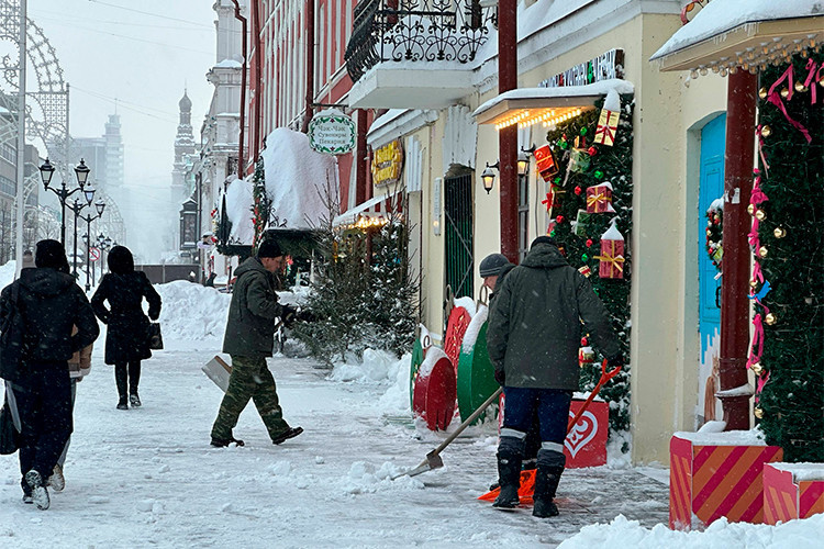 Улица Баумана выглядела так, будто в этот раз на ней к снегопаду готовились. Никаких сугробов и почти никаких узких тропинок. Подходы же к большинству магазинов и ресторанов активно расчищались дворниками. Один из них рассказал нам, сколько стоит «откопать» входную группу ресторана: за 2 тыс. он готов до асфальта вычистить участок в 30 кв. метров. Другой дворник поделился с нами, что не помнит более снежной зимы, чем эта, и предположил, что это все от влияния океанов.