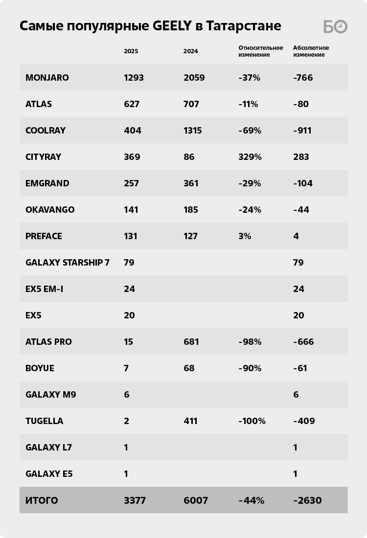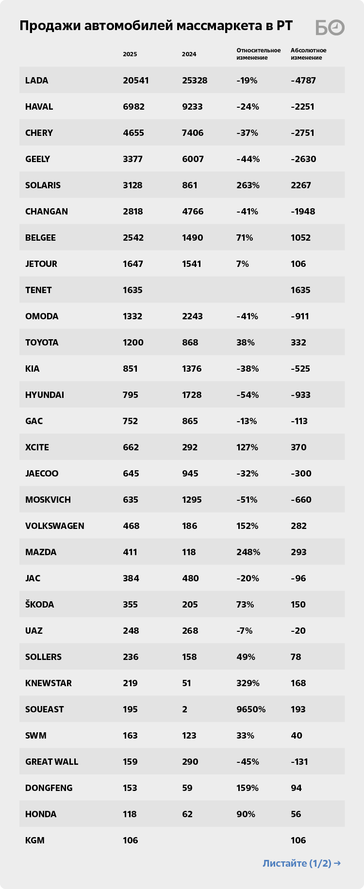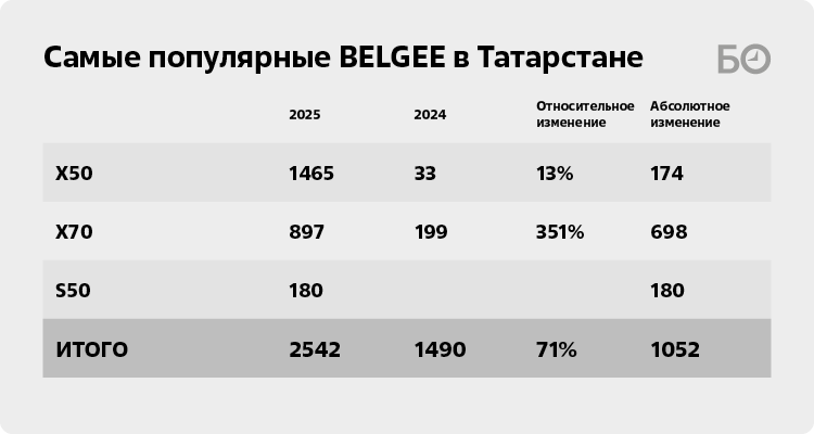 Что касается Belgee, то автомобиль, который производится на заводе белорусско-китайского СП «Белджи» под Минском, по итогам 2025 года выбрали 2 542 татарстанца. Это на 71% больше, чем в 2024-м.