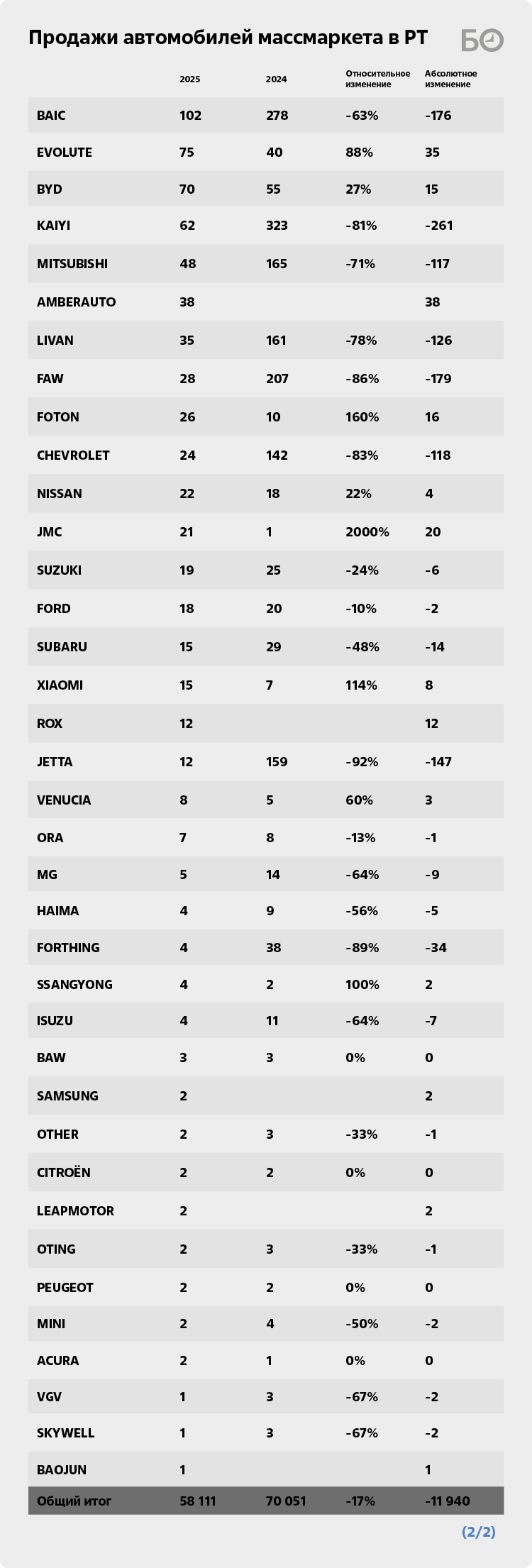Несмотря на то что китайские компании наращивают экспансию, развивая производство не только у себя на родине, но и в России, доля «коренных» машин из Поднебесной снизилась с 50,4 до 41%, показав падение на треть в абсолютном выражении. Если в 2024 году в республике было продано 35,3 тыс. новеньких китайских авто, то в 2025-м эта цифра составила почти 23,9 тысячи.