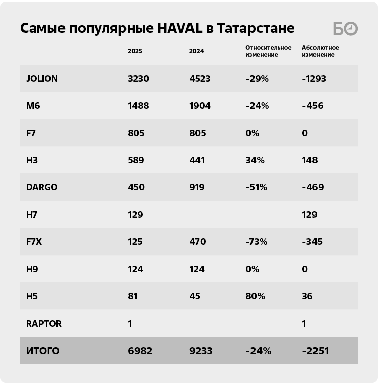 Несмотря на 29-процентное падение продаж, лидером марки Haval в нашей республике остается кроссовер Jolion. И это несмотря на то, что Haval Jolion сняли с производства в КНР, а сама модель не вошла в список автомобилей, соответствующих требованиям закона о локализации такси, опубликованный минпромторгом. В 2025 году было реализовано 3 230 новых машин.