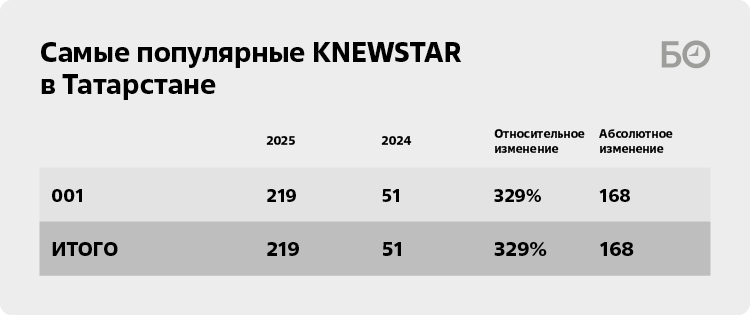 Китайский бренд Knewstar увеличил свои показатели более чем в 4 раза — с 51 до 219 поставленных на учет машин. Knewstar вышел на российский рынок пока только с одной моделью — купеобразным кроссовером с цифровым индексом 001. Knewstar 001 стал на российском рынке полноценной заменой Geely Tugella — с сайта Geely модель уже исчезла. Этим объясняются только две продажи Geely Tugella в Татарстане, когда еще в 2024-м их было реализовано в количестве 411 единиц.