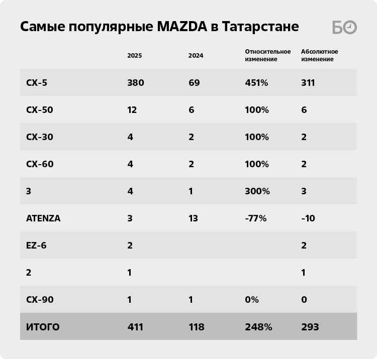 Аналогичный всплеск спроса у любителей автомобилей Mazda. Всего в прошлом году эту марку приметили для покупки 411 водителей, что в 3,5 раза больше, чем в 2024-м. 380 продаж пришлось на кроссовер CX-5, а 23 — на CX-50. Отметим, что из всех поставленных на учет Mazda 382 машины сошли с конвейера в Китае.