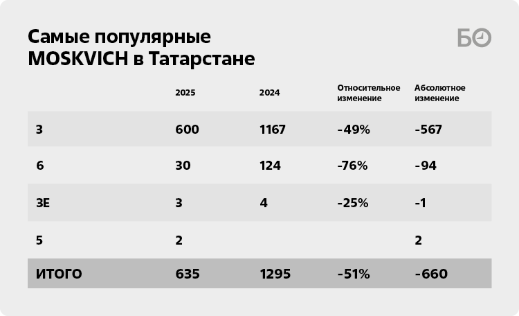 По итогам 2025 года бренд «Москвич» показал серьезное снижение продаж не только на российском, но и на татарстанском рынке. Причем на последнем больше всего. Если в целом по РФ продажи «Москвича» упали на треть, до 15,6 тыс. новых автомобилей, то в РТ на учет было поставлено в 2 раза меньше машин данного бренда — 635 ТС в 2025-м против 1 295 авто в 2024-м.
