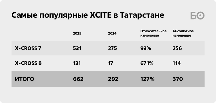 В 2025 году марка Xcite нарастила продажи автомобилей в Татарстане в 2,3 раза по сравнению с 2024-м. В прошедшем году продажи составили 662 кроссовера, 531 из которых — это X-Cross 7, а еще 131 экземпляр — X-Cross 8.