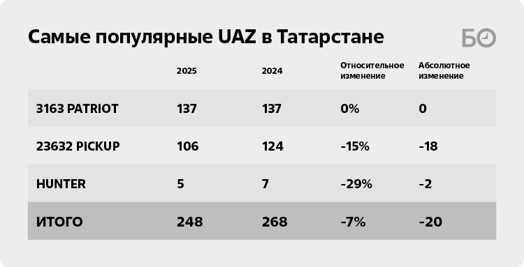 Еще один российский автопроизводитель — УАЗ — снизил реализацию своей продукции в РТ на 7%. Если по итогам 2024 года в республике было продано 268 машин, то в 2024-м — уже 248. Автомобиль повышенной проходимости для эксплуатации на дорогах всех категорий, а также по пересеченной местности 3163 Patriot показал стабильный спрос. Рыбаками и охотниками Татарстана было приобретено 137 таких авто — столько же, как и в 2024-м. Еще 106 продаж пришлось на пикап на базе Patriot, а 5 — на модель Hunter.