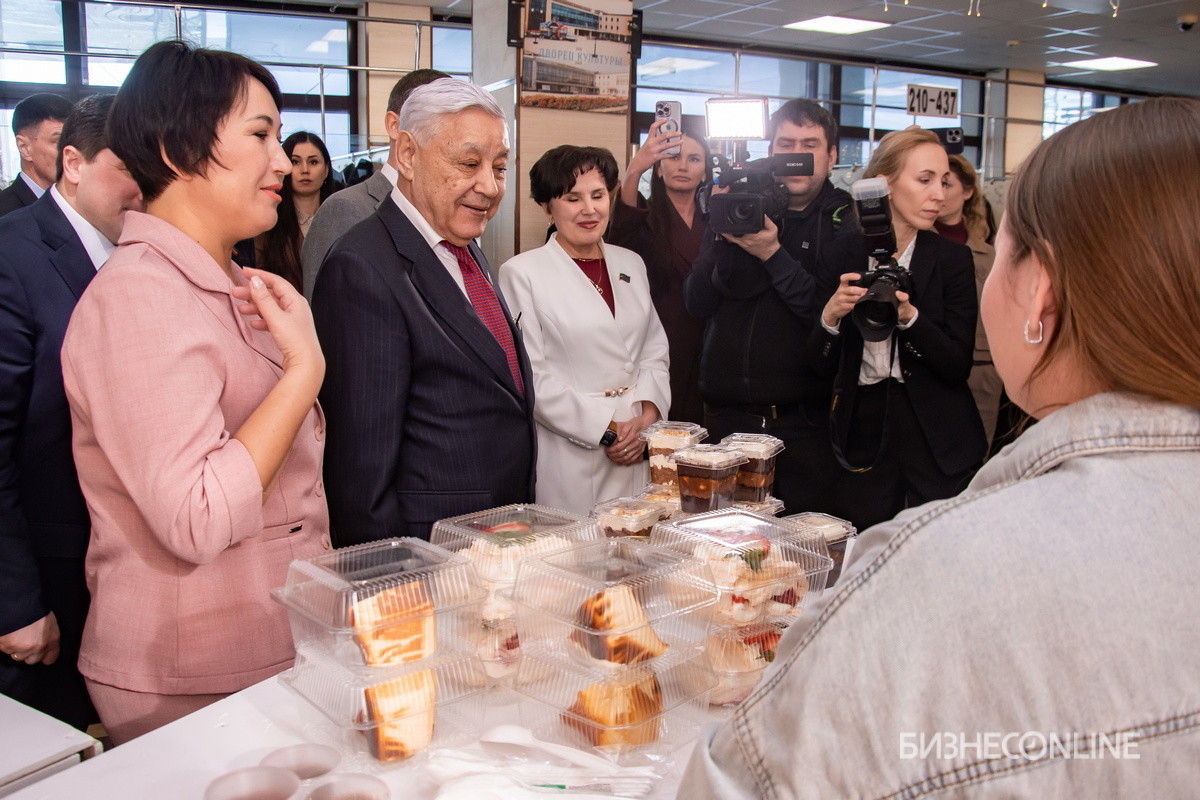 Встречали гостей женщины в национальных костюмах татарскими песнями и с караваем и баурсаком в руках рядом со входом в библиотеку, над которым висела надпись с указывающей стрелкой «убежище» — необходимый атрибут современной жизни. Мухаметшина попытались угостить — он любезно отказался и поспешил фотографироваться с народным коллективом. А затем ему показали огромную выставку — там были все и всё: от волонтеров СВО, продукции местных производителей, спортсменов, химических предприятий до индустриального парка ОЭЗ «Алабуга».