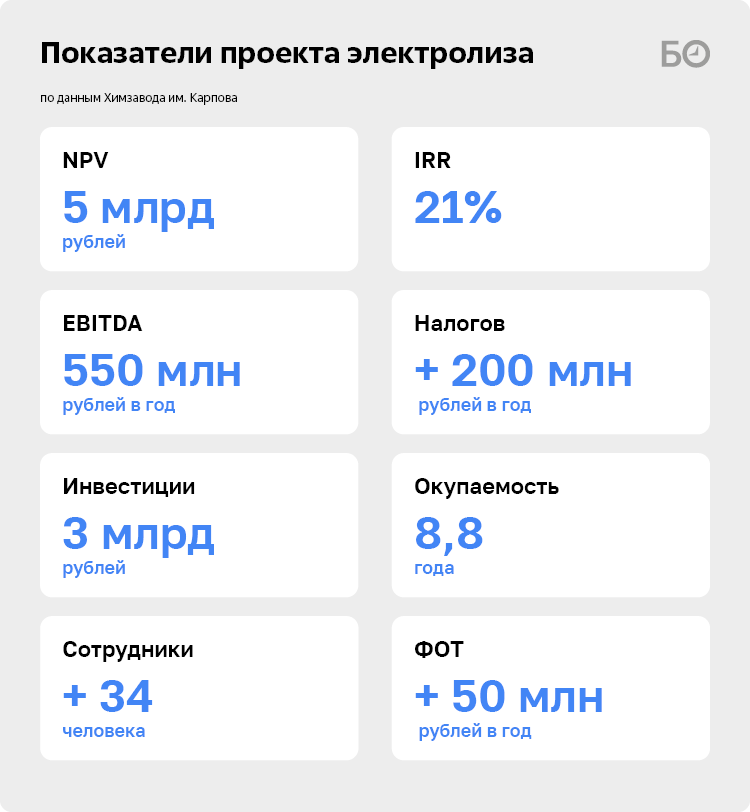 Любопытно, что в ходе отчетной сессии в Менделеевске на обозрение гостей был представлен «паспорт» «электролизного» проекта. NPV составит 5 млрд рублей, IRR — 21%, EBITDA — 550 млн рублей в год. Окупаемость — почти 9 лет, на производстве будут задействованы 34 сотрудника. Новое производство станет генерировать 200 млн рублей в виде налогов.