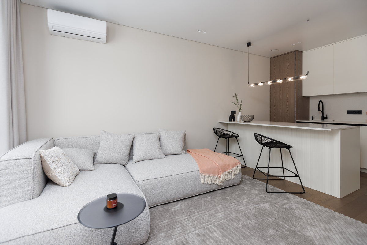 Сердце квартиры — кухня-гостиная с премиальным оснащением, спроектированная с акцентом на сценарии семейной жизни. За кухонным островом удобно не только готовить, но и собраться всей семьей в теплом кругу. Техническое оснащение соответствует стандартам премиального жилья. Помимо стандартного набора (духовой шкаф, микроволновая печь, варочная панель, встроенный холодильник), предусмотрены опции, которые редко встречаются даже в индивидуальных проектах: отдельная морозильная камера, винный холодильник, измельчитель пищевых отходов, кран для фильтрованной воды. Кстати, столешница острова выполнена из кварцевого агломерата — материала, который не боится царапин, не впитывает красящие продукты. «Можно резать ножом здесь без доски, и не страшно, что оно поцарапается!» — говорит дизайнер проекта.