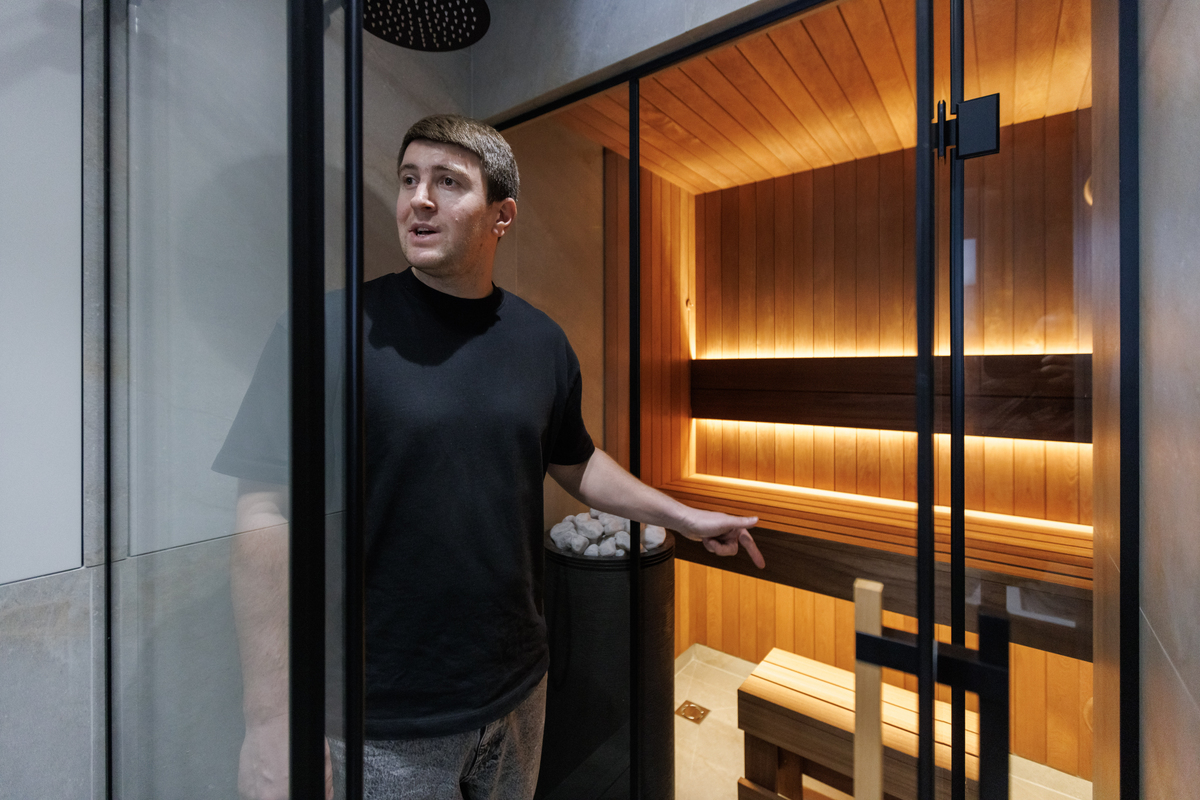 Это не сауна с сухим воздухом и теном, который нельзя лить водой. Здесь установлена печь российского бренда с закрытой каменкой. Она дает мягкий, влажный пар, безопасна для детей (корпус не обжигает), и при этом квартиру не нужно выстужать. Стеклянная перегородка держит температуру идеально. Такая квартира — как загородный дом, говорят в #Суварстроит. «Одни из наших покупателей продали свой дом в соседнем поселке и купили здесь квартиру, потому что они не хотят чистить снег (в ЖК это делает управляющая компания). Они хотят, чтобы им здесь было комфортно: вокруг лес, баня, красивые виды!» — говорит Абдулхаев.