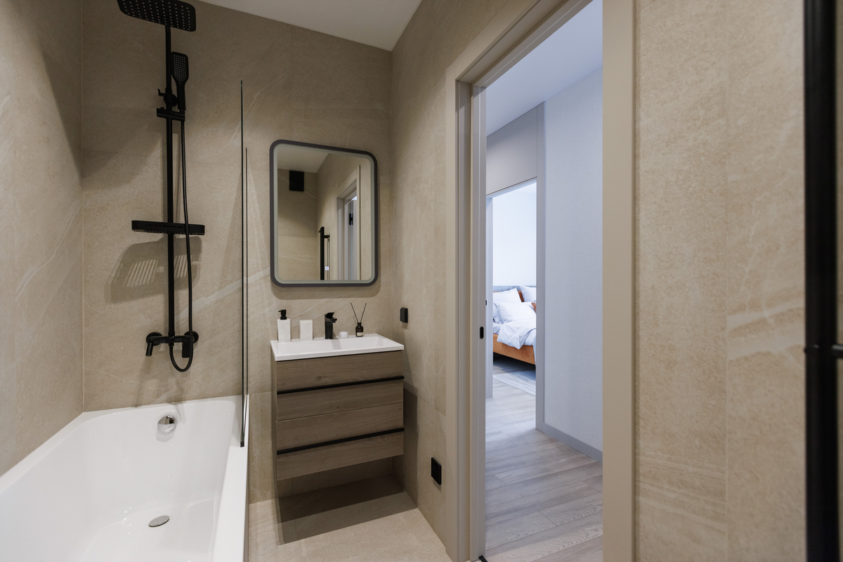 …в ванной — широкоформатный керамогранит с матовой текстурой Estima Gabbro White от российской компании, сантехника и смесители чешского бренда. Кстати, во всех санузлах установлены гигиенические души. Также предусмотрены электрические полотенцесушители и розетки для подключения бойлеров — на случай сезонных отключений горячей воды.