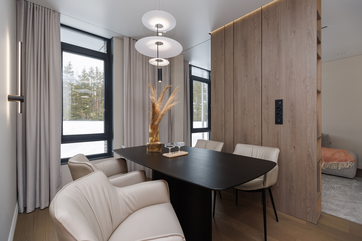 Здесь дизайнеры пошли еще дальше, используя в отделке натуральный шпон и кварц-паркет вместо ламината — материал с основой из каменной крошки и верхним слоем из натурального шпона. В окнах — алюминиевый профиль с двухкамерными стеклопакетами и архитектурным напылением, обеспечивающим зеркальный эффект. Это дорогое решение, характерное скорее для частного домостроения, но здесь примененное во всех квартирах. А в одной из них на первом этаже реализовано уникальное для Татарстана решение — частная баня.
