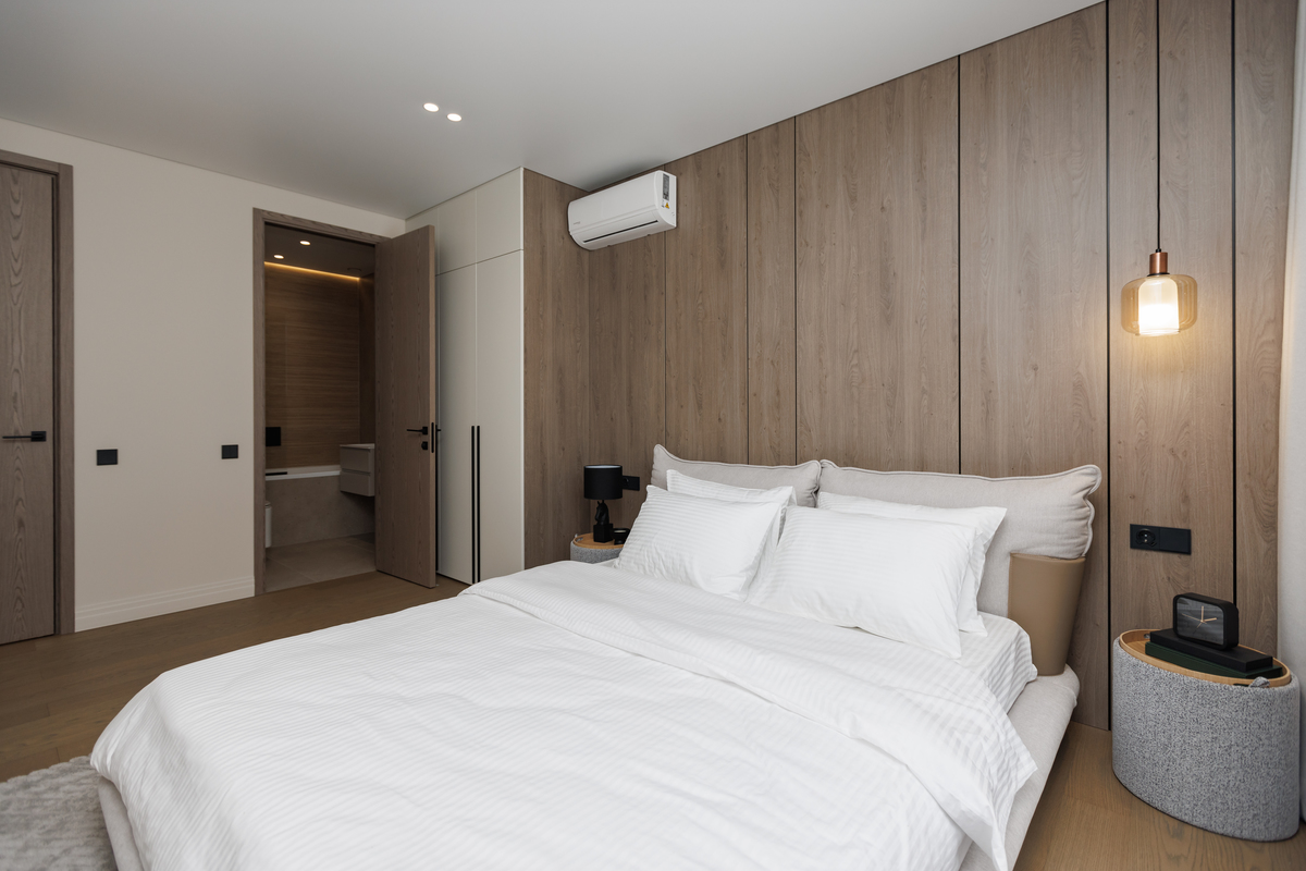 Вся мягкая мебель изготовлена под заказ в коллаборации с российским заводом. В спальне — кровать с мягким изголовьем, ортопедическим матрасом и автоматической системой управления шторами. Инверторные кондиционеры (тихие и экономичные) уже входят в стоимость квартиры. В гардеробной продумана система хранения с акцентом на плечики для одежды и удобными нишами. Во всех санузлах квартиры — теплые полы. А в детской уже есть встроенный шкаф в потолок, светильники, а розетки продуманы так, чтобы расставить мебель. Детская комната не оборудована мебелью намеренно — здесь может быть и кабинет, и детская, как захотят сами жильцы. Но при этом расположение розеток продумано заранее, чтобы родителям не пришлось потом ломать голову, где будет стоять кровать, а где — письменный стол.
