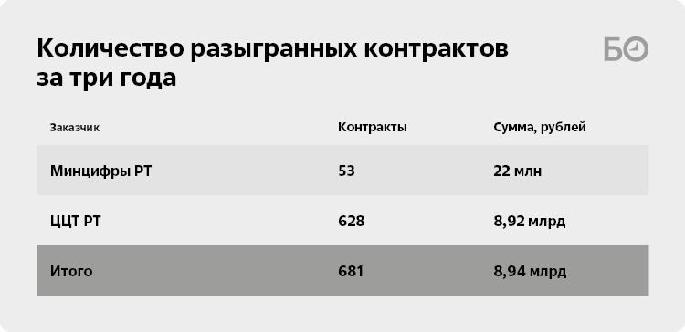 В целом московские компании за три года получили от ЦЦТ порядка 930 млн рублей — более 10% от общего объема контрактов. Всего за пределы Татарстана ушло контрактов примерно на 1,7 млрд рублей из 9 млрд, или около 19% бюджета.