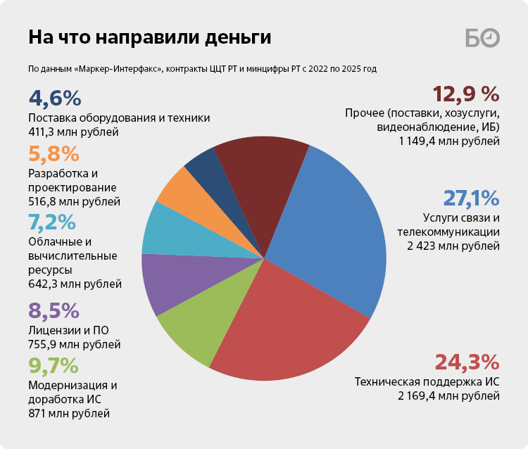 Больше всего средств тратится на связь и телекоммуникации: 2,4 млрд рублей — 27% от всей суммы, потраченной за три года. На 2-м месте — техническая поддержка информационных систем: 2,2 млрд (24%), на 3-м — модернизация и доработка информационных систем: 871 миллион (10%). Эти три категории забирают чуть больше половины всех средств. Заметную долю также занимают лицензии и ПО (756 млн), облачные и вычислительные ресурсы (642 млн), разработка новых систем (517 млн) и поставка оборудования (411 млн). На информационную безопасность приходятся скромные 130,5 млн — 1,5% бюджета.