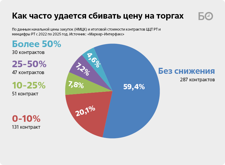 Тройка главных получателей таких контрактов все та же: «Таттелеком» (1,92 млрд), ЦИТ РТ (1,42 млрд) и ИТ-парк (758 млн). Вместе они получили 63% от всей суммы контрактов, заключенных с единственным поставщиком. В 56% случаев подается лишь одна заявка. Закупки с двумя и более участниками составляют около 40%.
