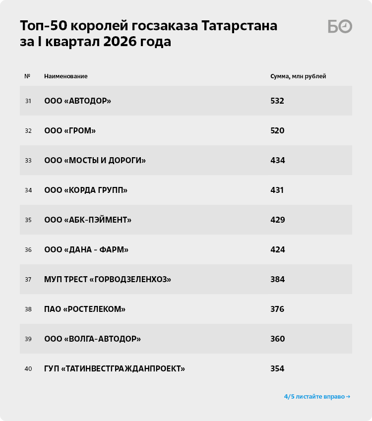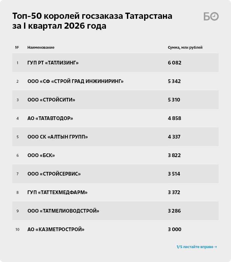 Несмотря на дефицит республиканского бюджета, по итогам 2025 года объем государственных закупок в РТ вырос на четверть, достигнув 606 млрд рублей. В I квартале 2026-го тенденция продолжилась: по данным системы «Маркер-Интерфакс», распределители бюджетных средств заключили с первой полусотней компаний-исполнителей контрактов почти на 76 млрд рублей, это на 15 млрд рублей больше, чем в I квартале 2025-го. Основные получатели бюджетных подрядов традиционно — строители и дорожники.