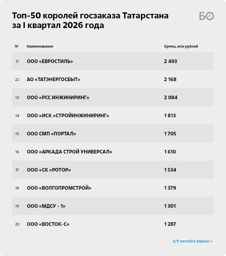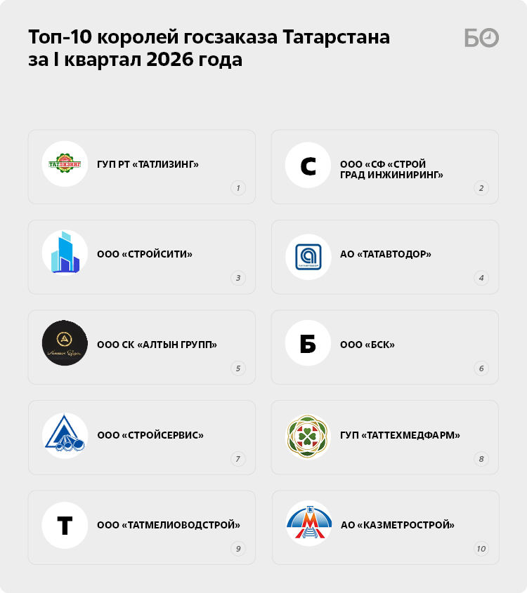 7-е место в рейтинге крупнейших государственных подрядчиков заняло ООО «Стройсервис» (7) Ильдара и Назии Мингалиевых. В I квартале текущего года компания, заключив 10 контрактов, получила подрядов на 3,5 млрд рублей. Это на 1 млрд рублей больше, чем в январе – марте 2025-го.