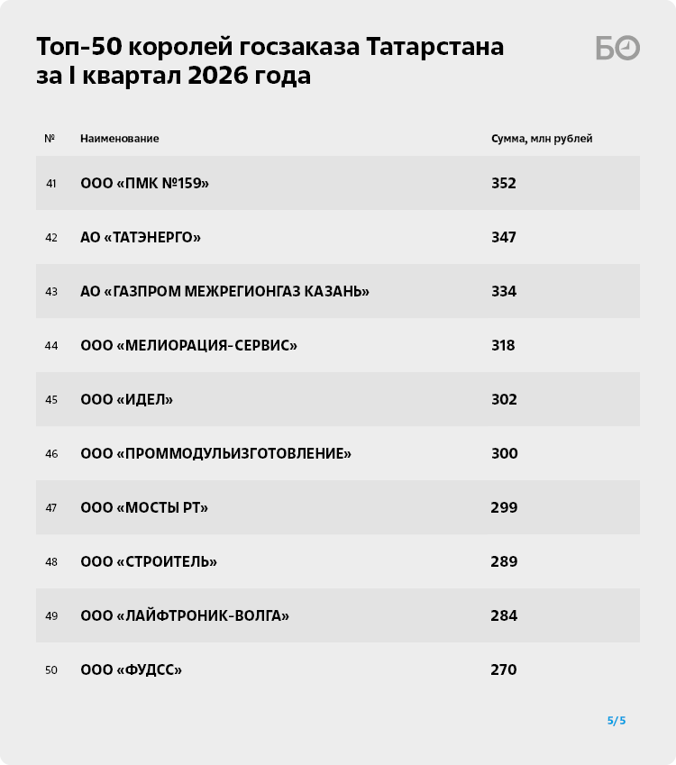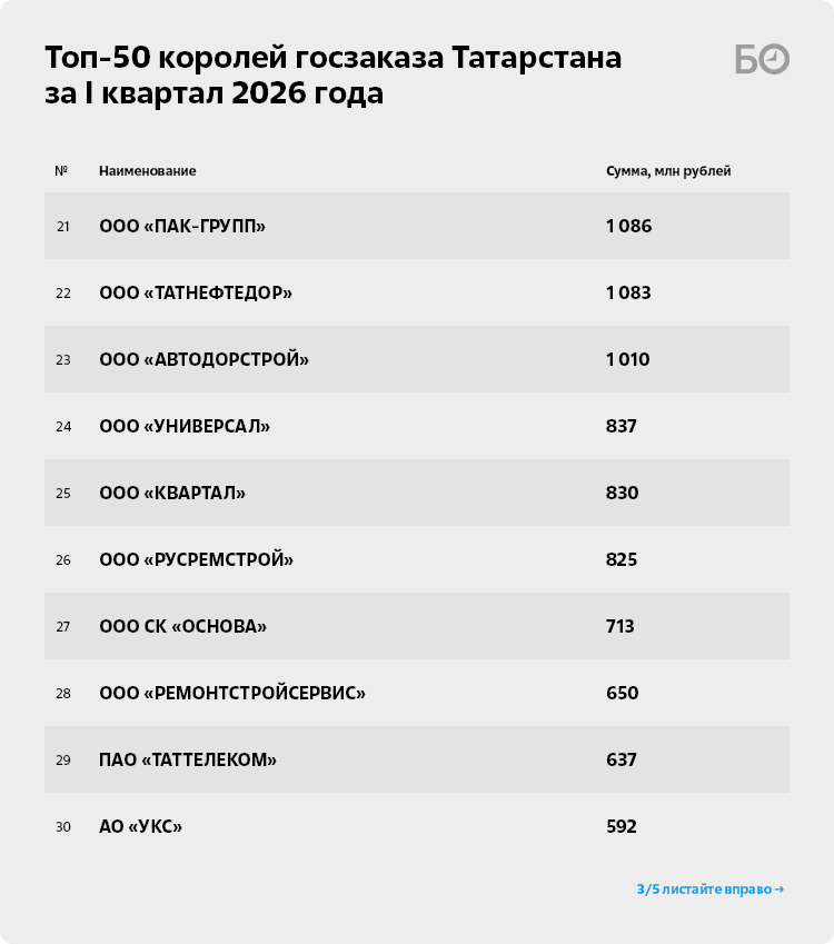 Если по итогам I квартала 2025-го компания Ефремова законтрактовалась на 3,5 млрд рублей (4-е место в рейтинге), то уже в I квартале текущего года сумма контрактов перевалила за 5,3 млрд рублей. По итогам первых трех месяцев 2026-го в копилке у компании появилось 17 новых договоров, 10 из которых были подписаны с Главстроем РТ, пять — с ГИСУ РТ, по одному контракту «прилетело» от гимназии им. Толстого и ДСО Казани. Все они связаны с выполнением строительных работ.