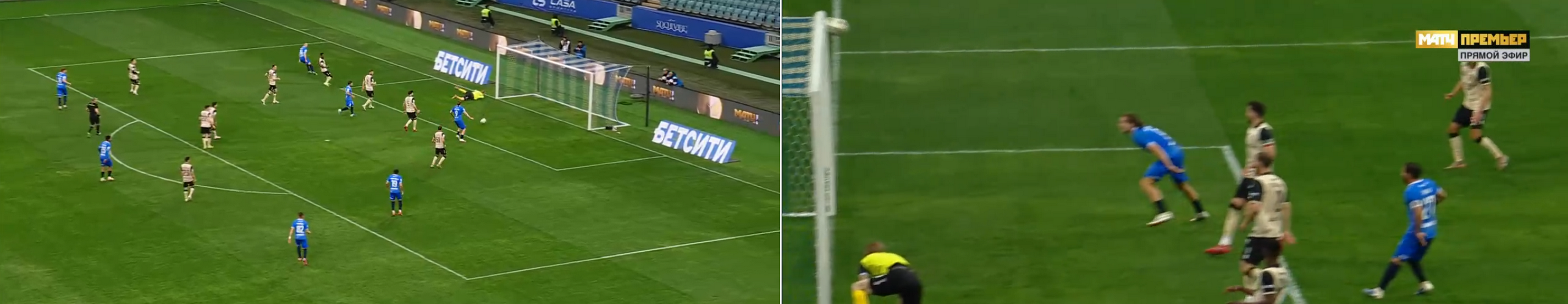 Начо показал проблеск гениальности: отдал прекрасный пас верхом в свободную зону на Арройо в полуфланг. Колумбиец получил большое пространство и беспрепятственно прострелил в штрафную. На дальней штанге забегал Руслан Безруков. Именно из той зоны, где должен был быть Заика, — партнер его не подстраховал, и Безруков замкнул подачу — 1:0.