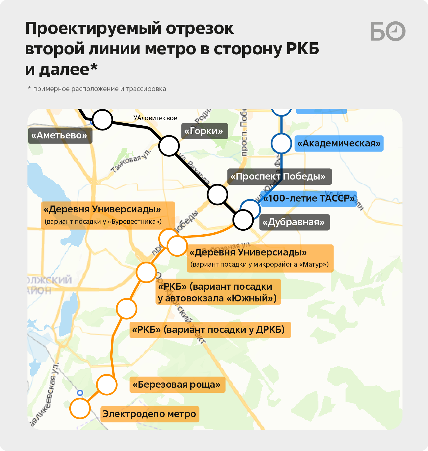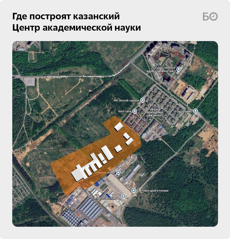 По информации источников «БИЗНЕС Online», место выбрано недалеко от выезда в сторону аэропорта. Участок примерно в 9 га находится между жилым комплексом «Лесной городок», Казанским маслоэкстракционным заводом, Березовой рощей (одна из точек гуляний во время Сабантуя) и улицей Братьев Батталовых. Словом, неподалеку от поселка Мирного.