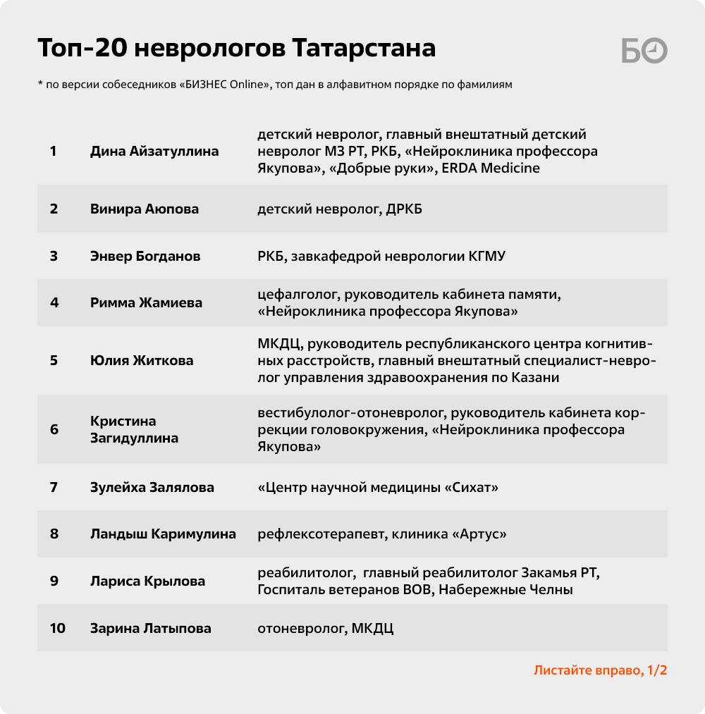 В отоневрологии — работе с головокружениями и вестибулярным аппаратом — хвалят Зарину Латыпову из МКДЦ и Кристину Загидуллину, которая возглавляет кабинет коррекции головокружения в клинике Якупова.